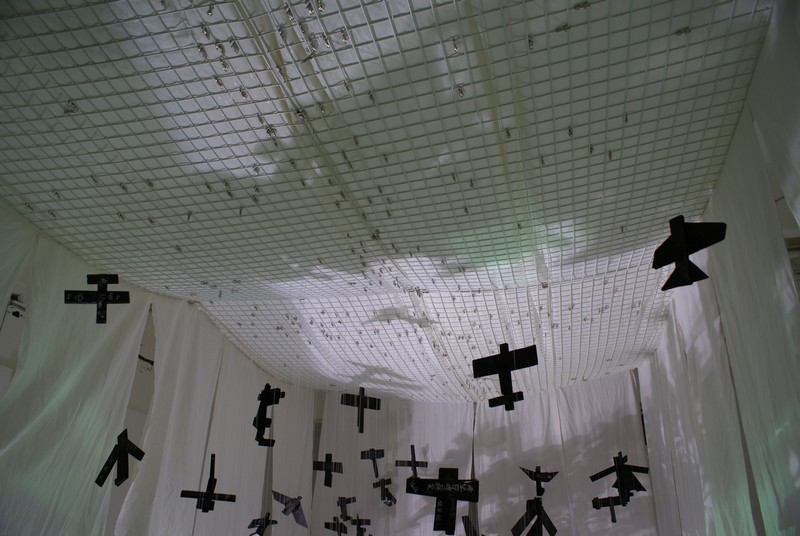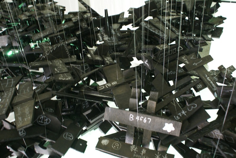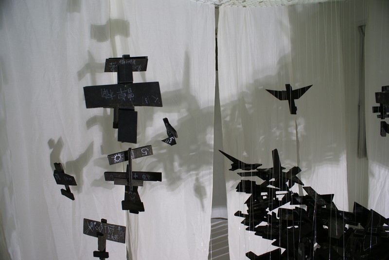 Suspension is a collective work made by the artist and the children under age of 10 when they came to my exhibition in 2008. Parents told them the history of the Kai Tak Airport. They made their own wooden planes and wrote down their names and hopes on them to cherishing the collective memories of Hong Kong. Suspension means hanging and floating in the air, it suggests the retirement of the Kai Tak Airport and also expresses the uncertainty of the children, whether their hopes will come true or not in the future.
